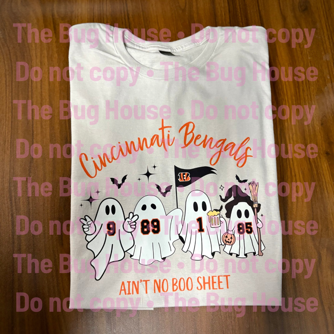 Support your favorite sports team with this quirky and cute "Cinci Ain't No Boo" shirt. Show off your love for Cincinnati while making a playful statement with the "ain't no boo sheet" phrase. Perfect for any fan who doesn't take themselves too seriously. Go team!