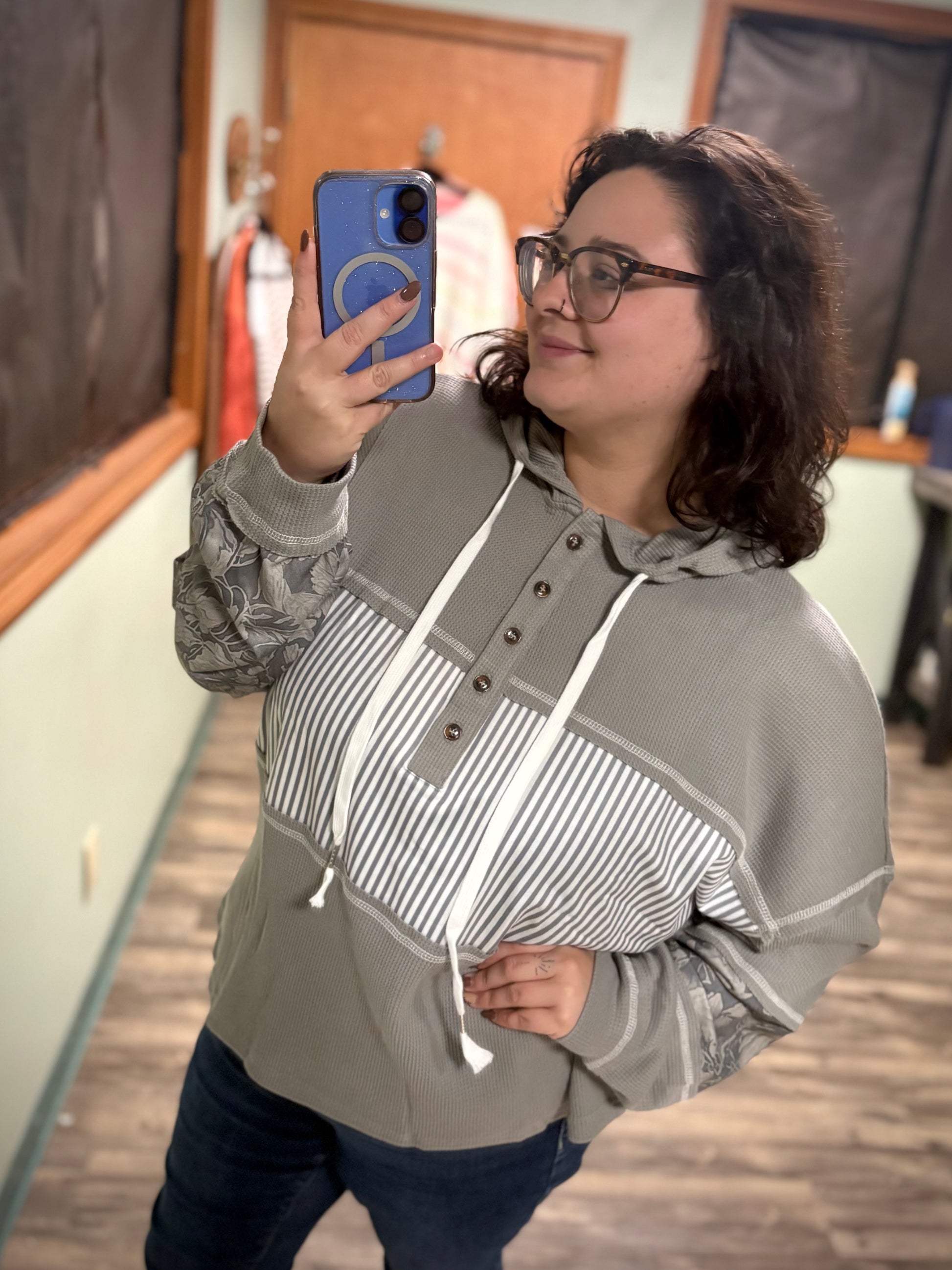 Stay stylish with our Breakout hooded top in grey waffle knit. The gorgeous floral and lace print sleeves add a touch of elegance, while the fun stripe detail adds a playful twist. Perfect for layering up and staying cozy!