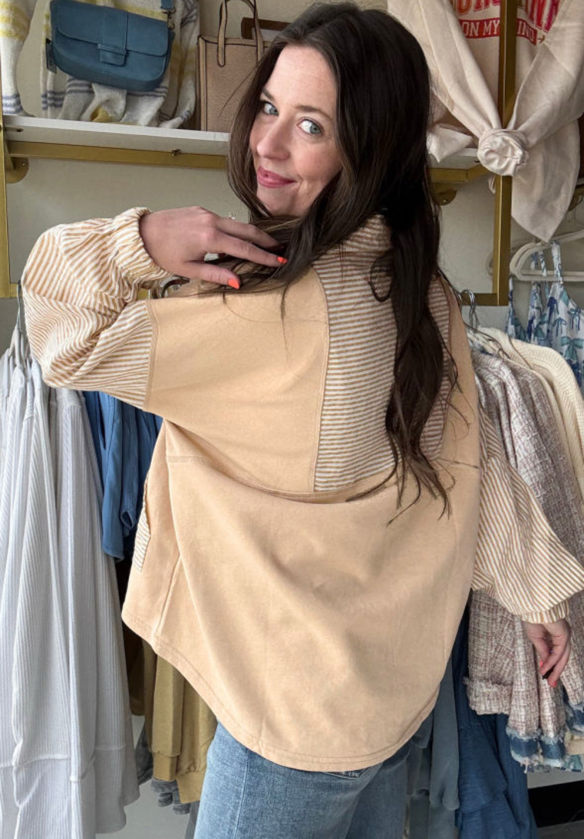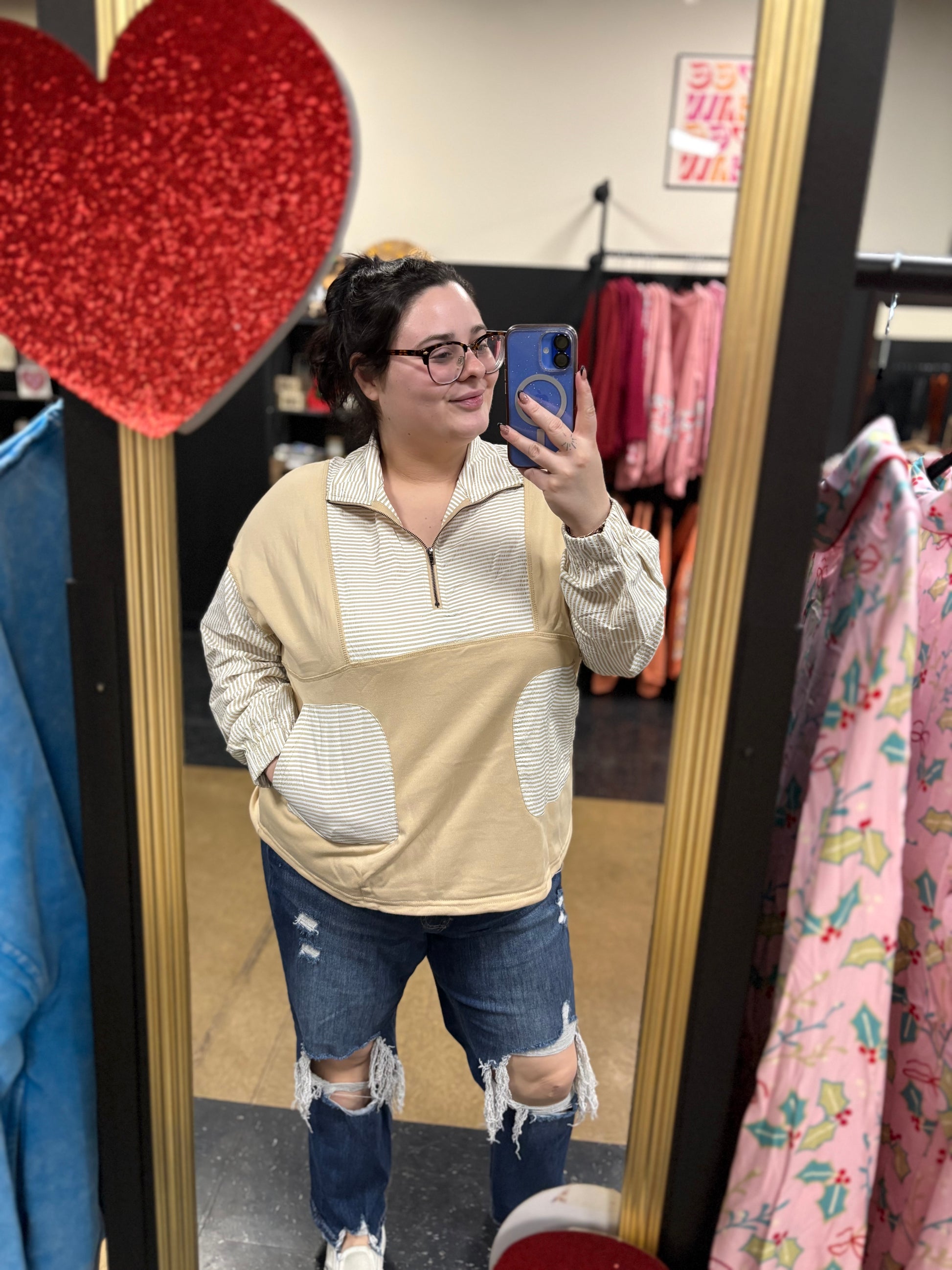 Get ready to make a statement with our Striped Smoke Show - Quarter Zip Pullover! Featuring unique stripe patchwork accents and an oversized fit, this pullover is sure to turn heads. The zipped collar adds a touch of functionality while the relaxed fit and side pockets provide comfort and convenience. Don't miss out on this casual yet chic addition to your wardrobe!