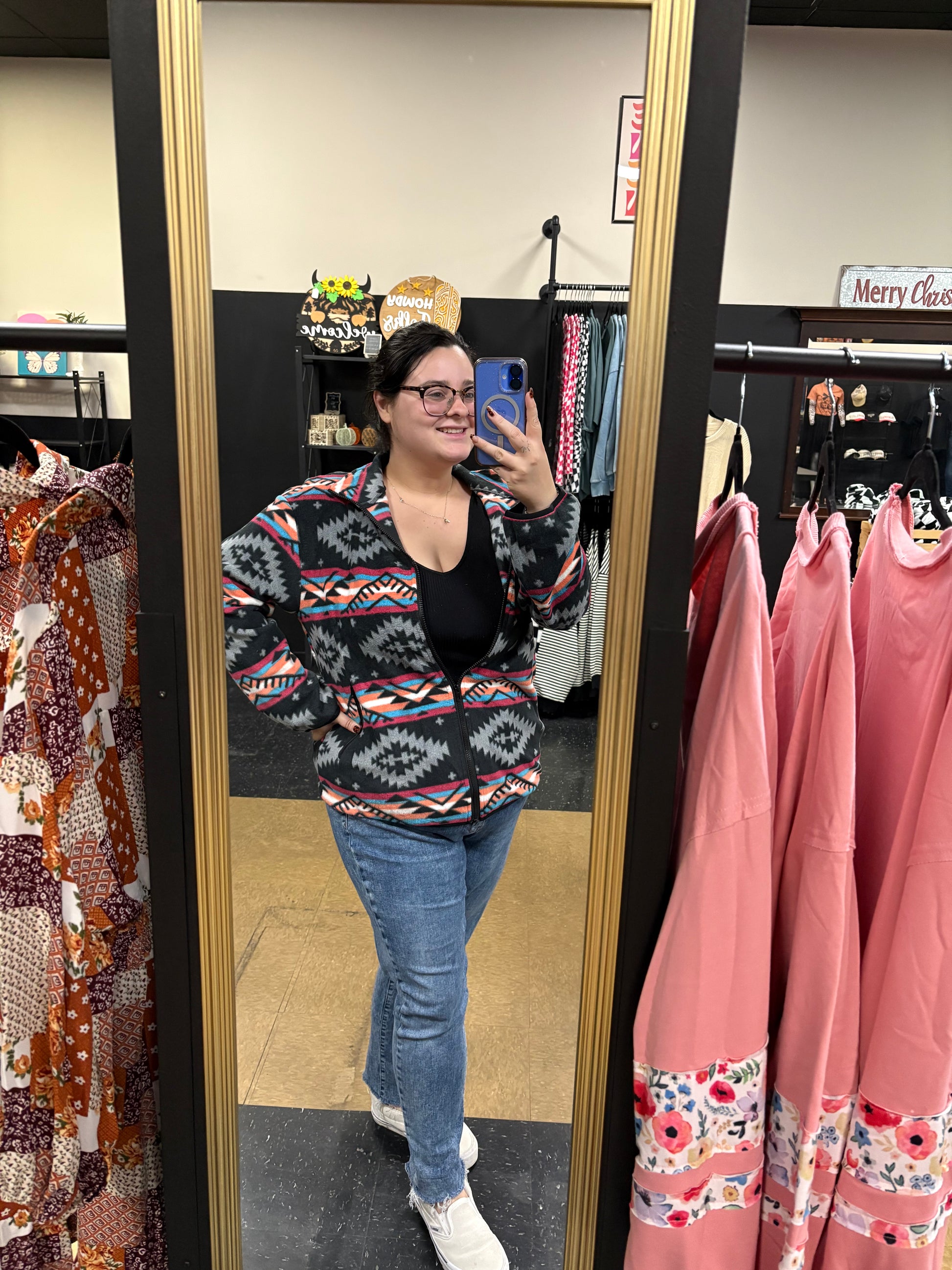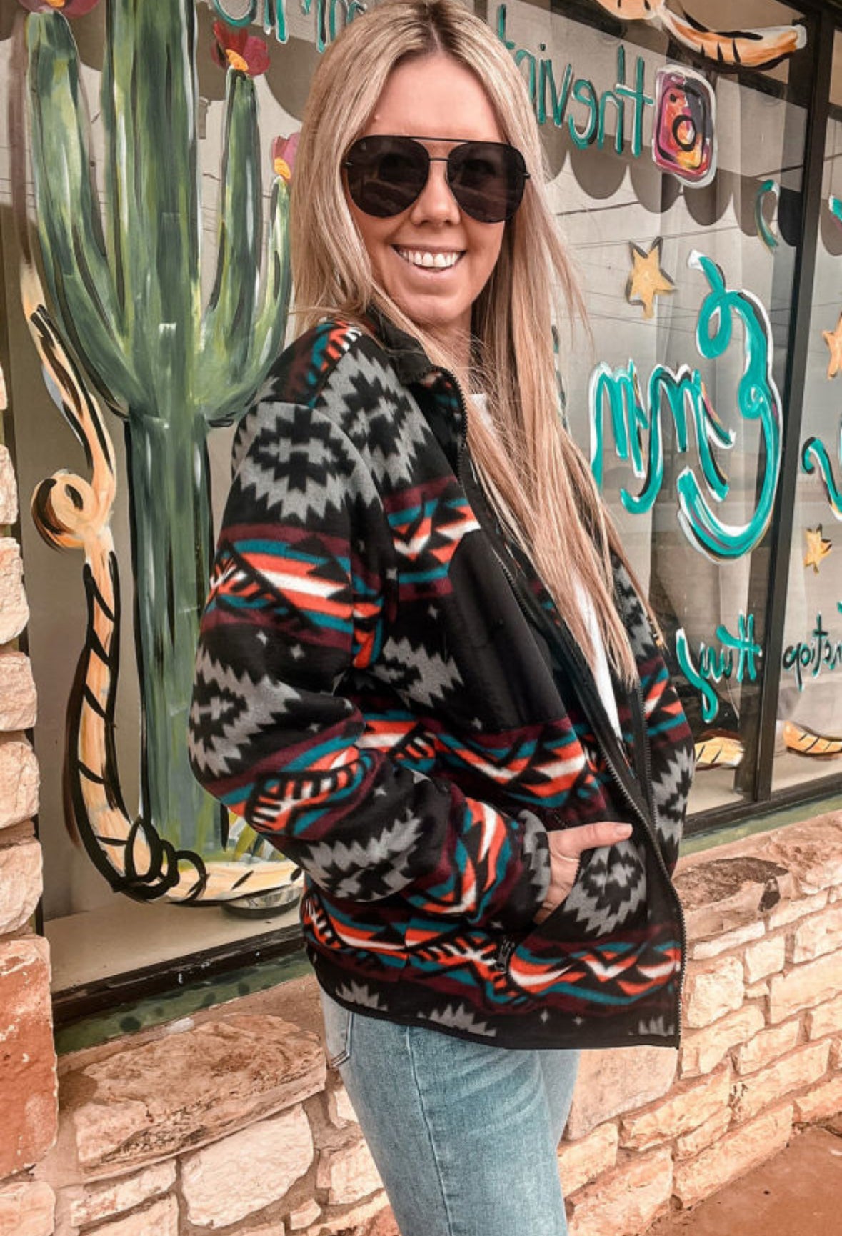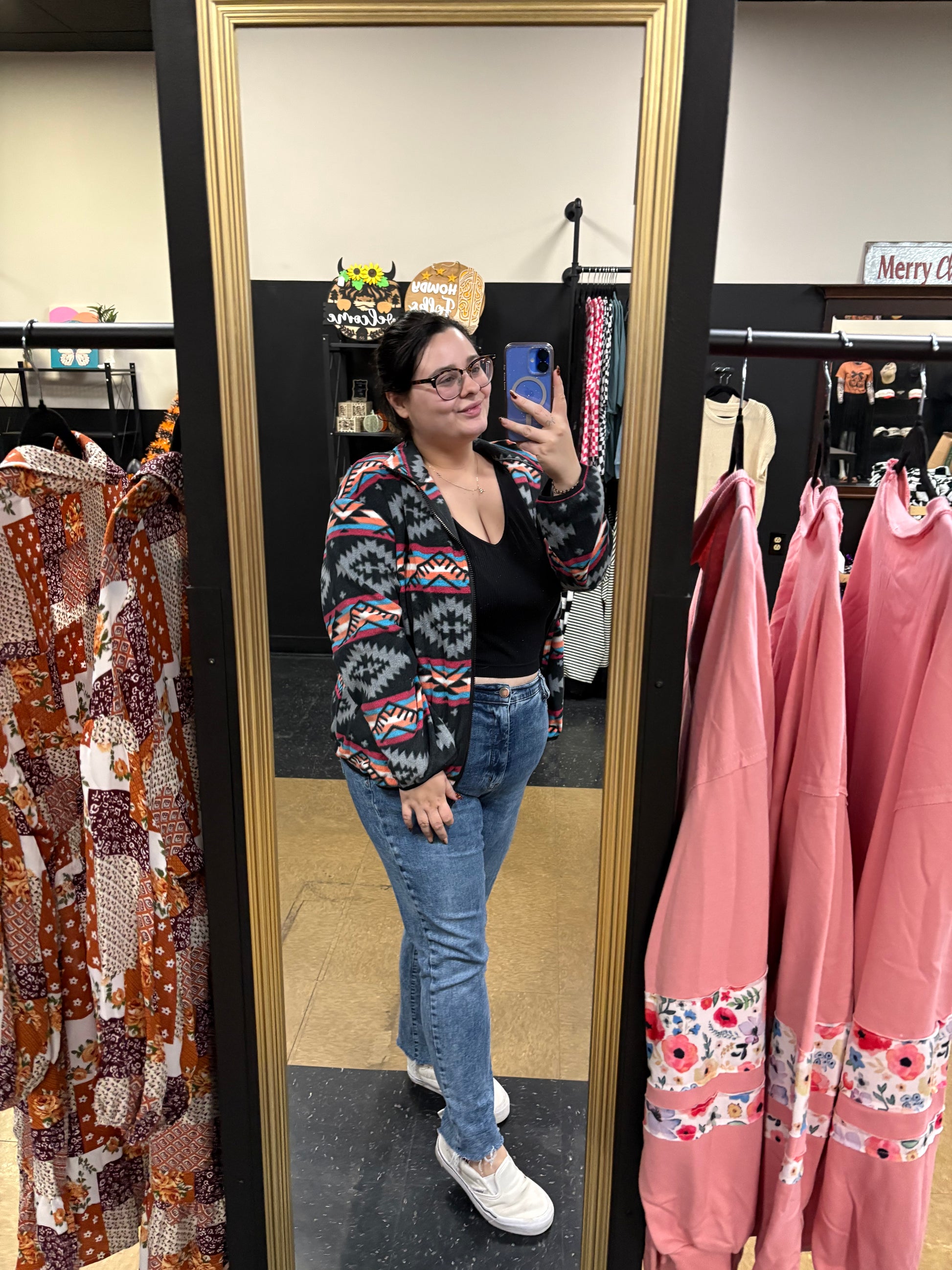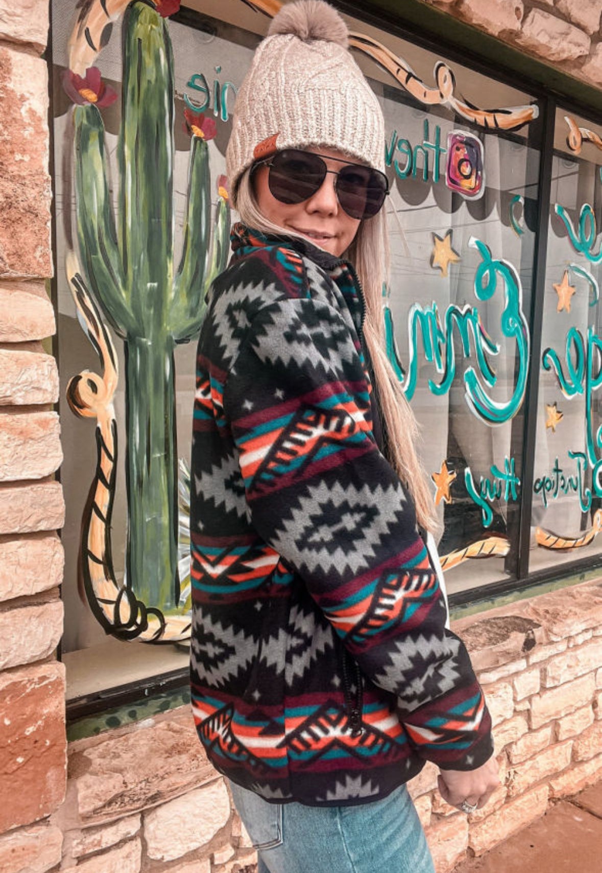 Introducing Western Warmth - the coziest fleece with a cute Aztec design! Keep warm and stylish with lots of pockets for your essentials. Perfect for chilly seasons.