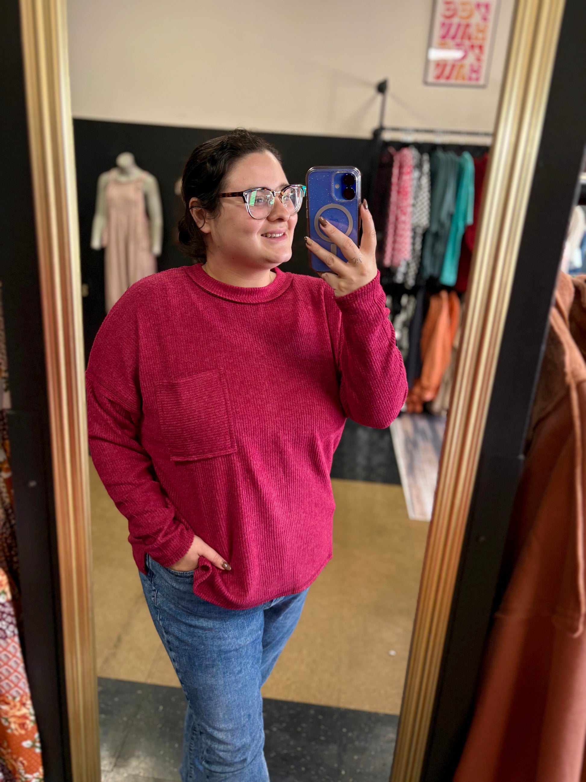 Stay cozy and cute with the Wine Not Cabernet pocket sweater. Made from supersoft material, this adorable sweater features a fun pocket detail and comes in a rich Cabernet color. Perfect for wine lovers (or anyone who loves a good sweater). Cheers to style and comfort!